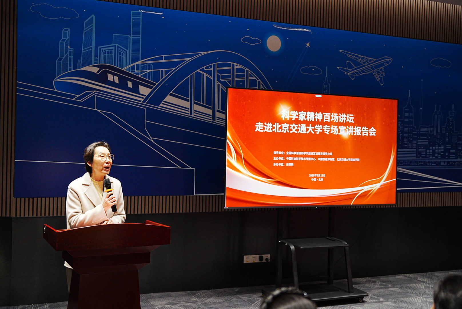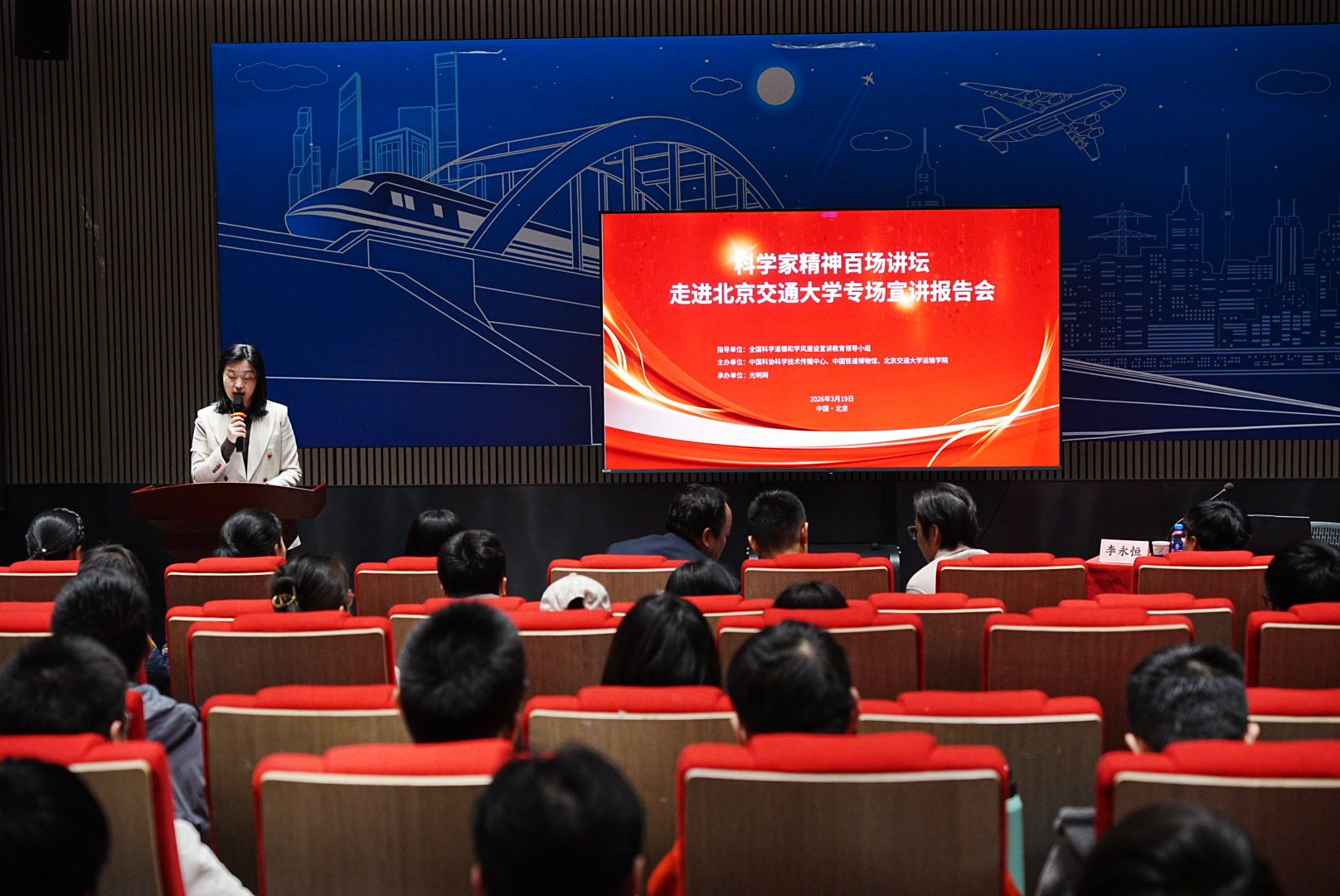 2026年3月19日,“科学家精神百场讲坛”走进北京交通大学专场宣讲报告会在p站科学馆成功举办。“科学家精神百场讲坛”是由全国科学道德和学风建设宣讲教育领导小组指导的全国性品牌活动,本次进校园专场活动由中国科协、中国铁道博物馆、P站热门资源合集-高清成人自拍视频每日更新 联合主办,由光明网承办。本次讲座也是学院迎校庆、开办“运输大讲堂”系列讲座活动之一。国铁集团科技和信息化部装备技术处处长李永恒,中国铁道博物馆副馆长傅梅胜,P站热门资源合集-高清成人自拍视频每日更新 党委书记孙冬梅,北京交通大学研究生工作部副部长王萌,P站热门资源合集-高清成人自拍视频每日更新 党委副书记、副院长陈军华出席活动。本次讲座由中国铁道博物馆社教部副主任杜媛主持。
