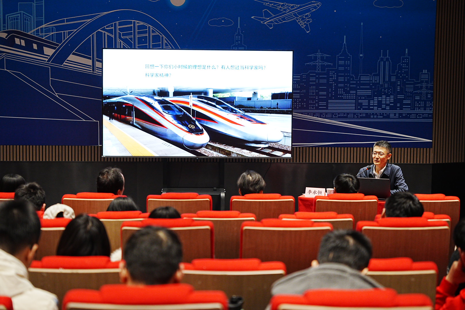 李永恒处长深入讲述了复兴号及CR450动车组研发背后的创新故事。他以翔实的数据和生动的案例,展示了中国铁路从跟跑到领跑的跨越式发展,阐述了科学家精神在铁路行业实践与传承中的深刻内涵,强调正是凭借坚持自主创新、甘于奉献、勇于担当的科学家精神,才使中国高铁技术跻身世界前列。他勉励在座青年学子继承老一辈铁路科技工作者的拼搏精神,将个人成长与国家需求紧密相连,以青春智慧助力中国铁路蓬勃发展。